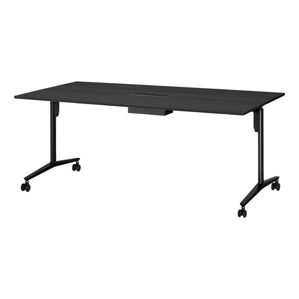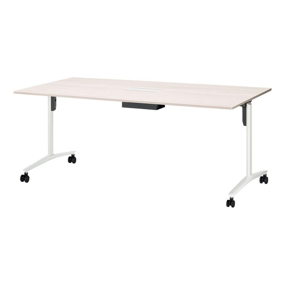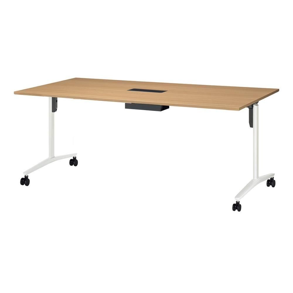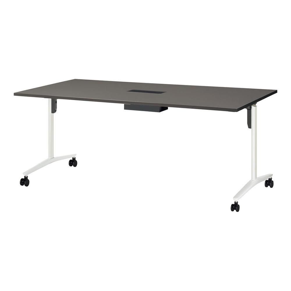 こちらの商品は、長方形天板、T字脚、キャスター、配線ボックス、幅1500×奥行900×高さ720mmタイプです。脚カラーは3色、天板カラーは8色から選べます。