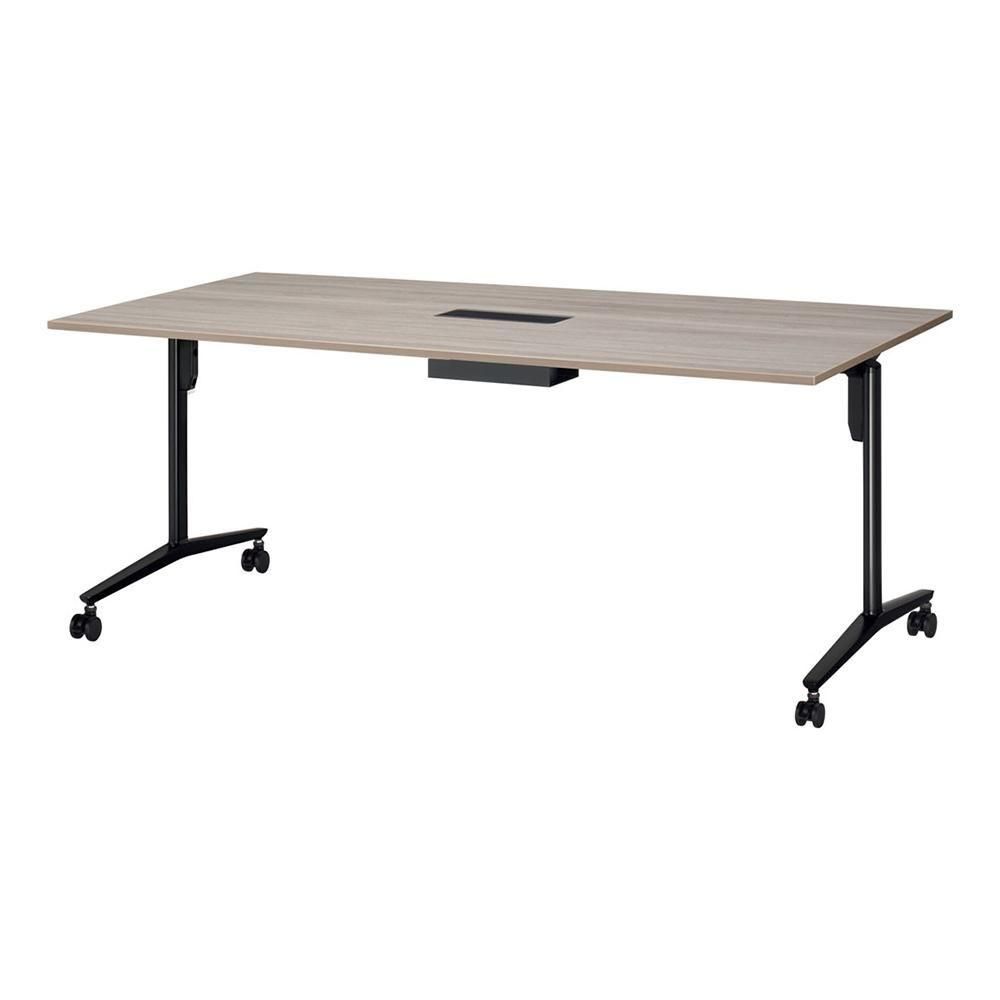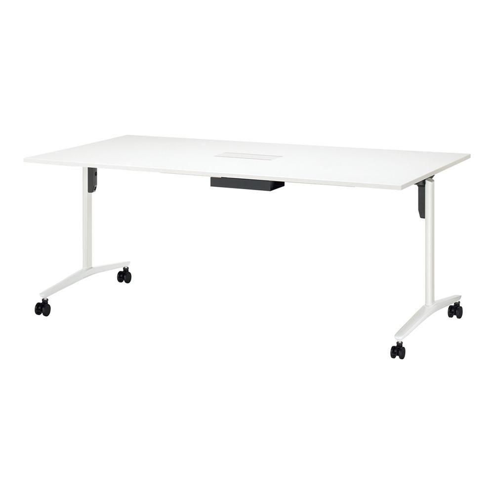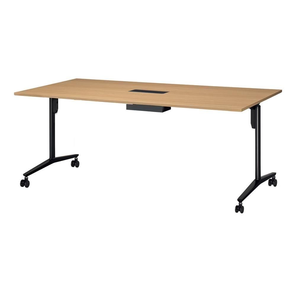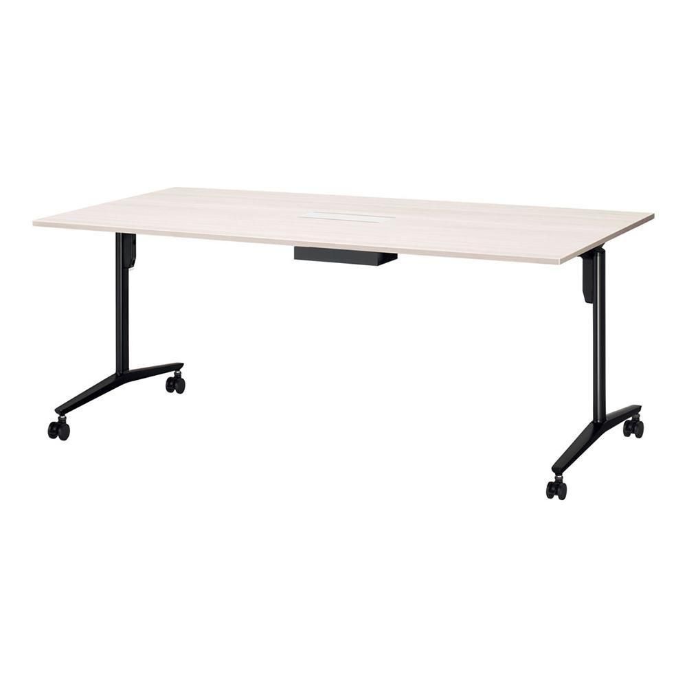 こちらの商品は、長方形天板、T字脚、キャスター、配線ボックス、幅1800×奥行900×高さ720mmタイプです。脚カラーは3色、天板カラーは8色から選べます。