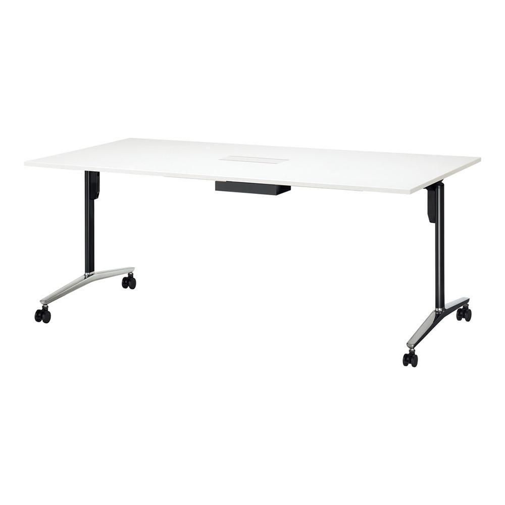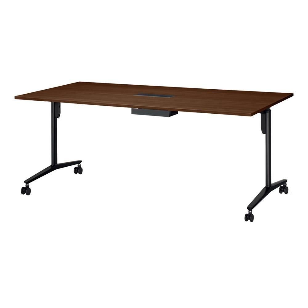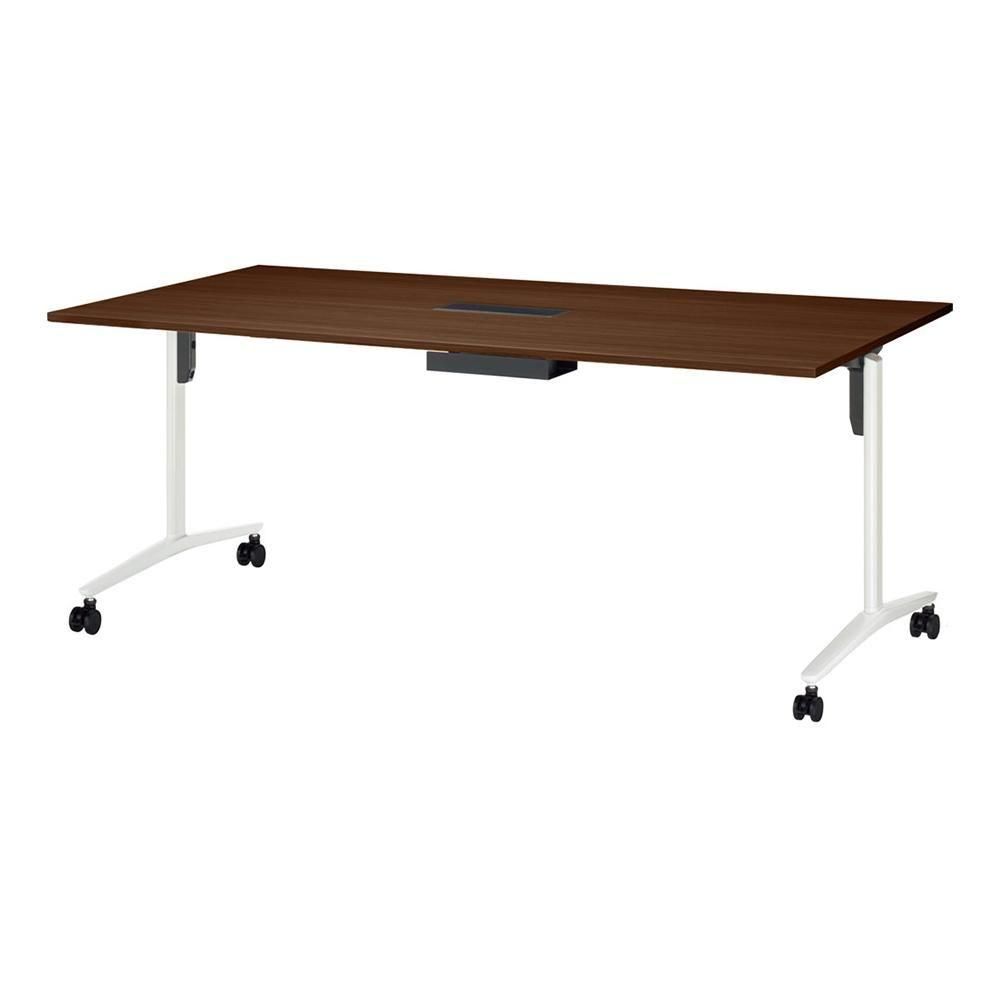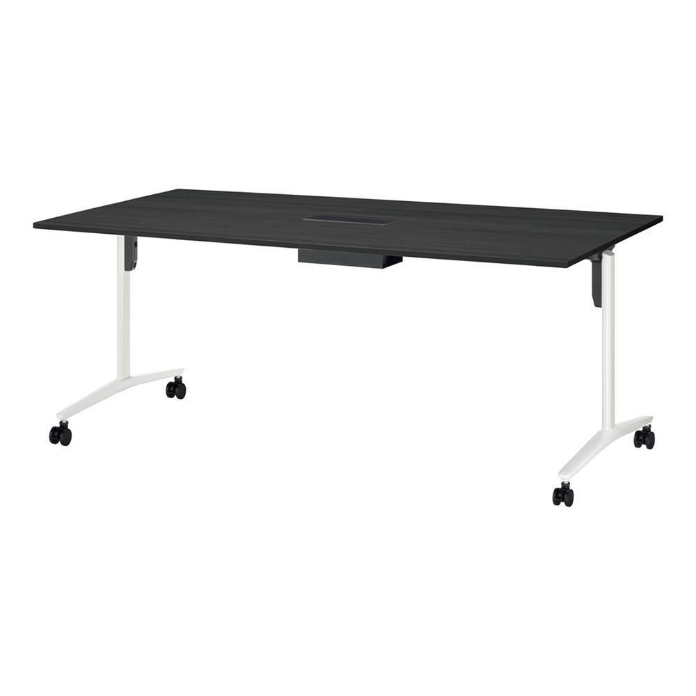 こちらの商品は、長方形天板、T字脚、キャスター、配線ボックス、幅1800×奥行900×高さ720mmタイプです。脚カラーは3色、天板カラーは8色から選べます。