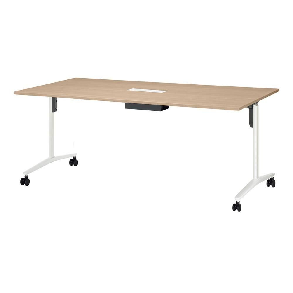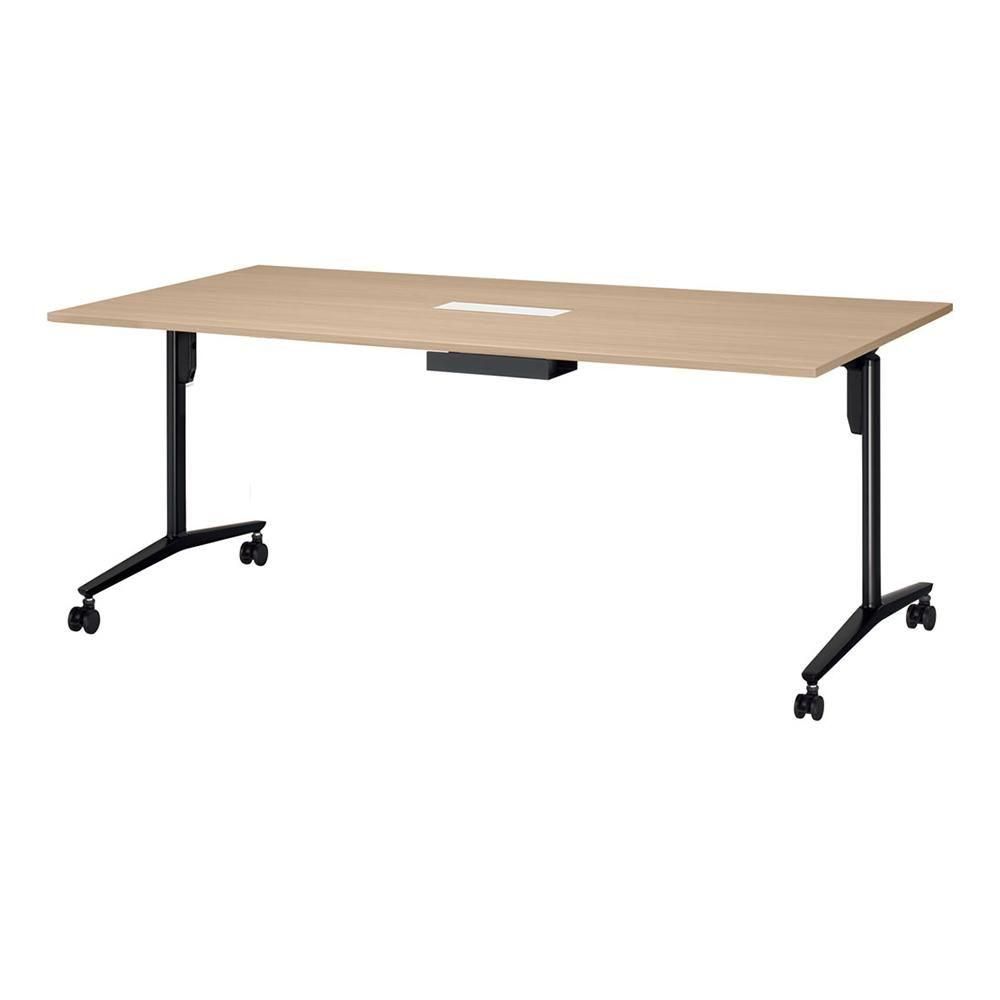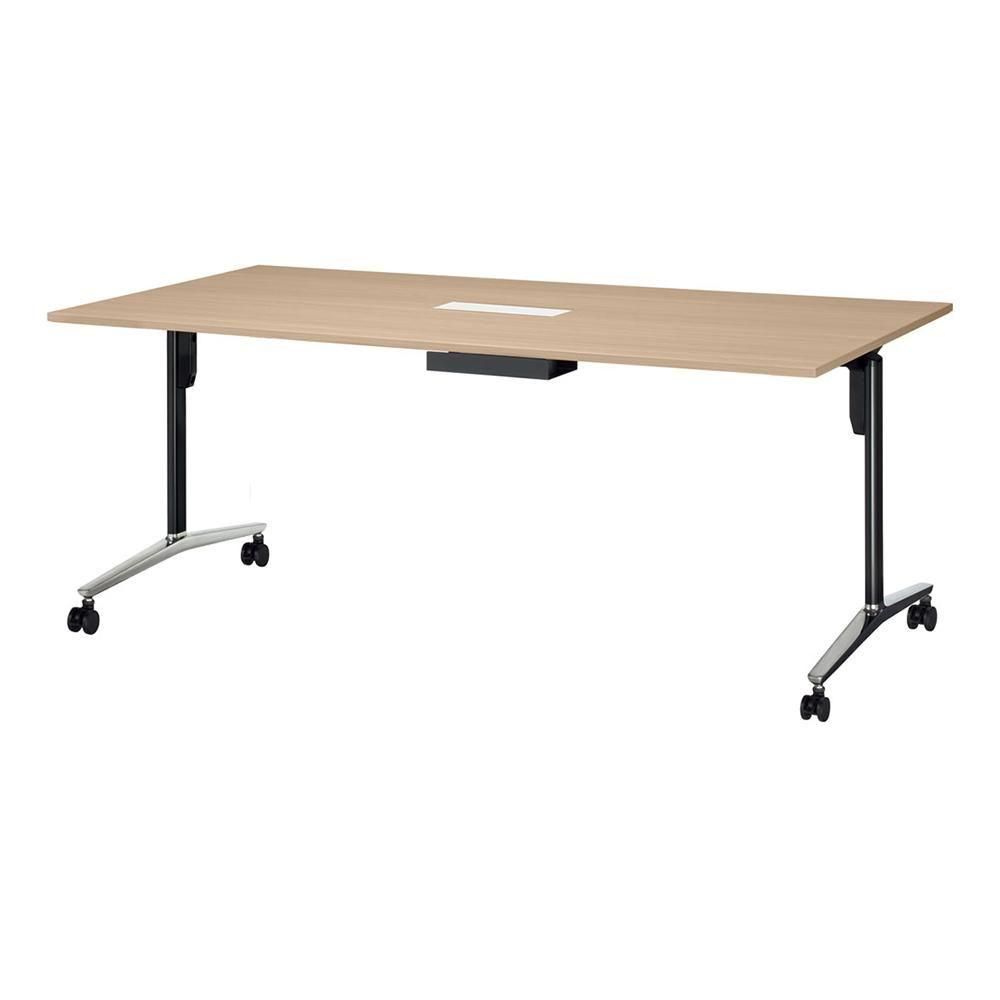 こちらの商品は、長方形天板、T字脚、キャスター、配線ボックス、幅2100×奥行900×高さ720mmタイプです。脚カラーは3色、天板カラーは8色から選べます。