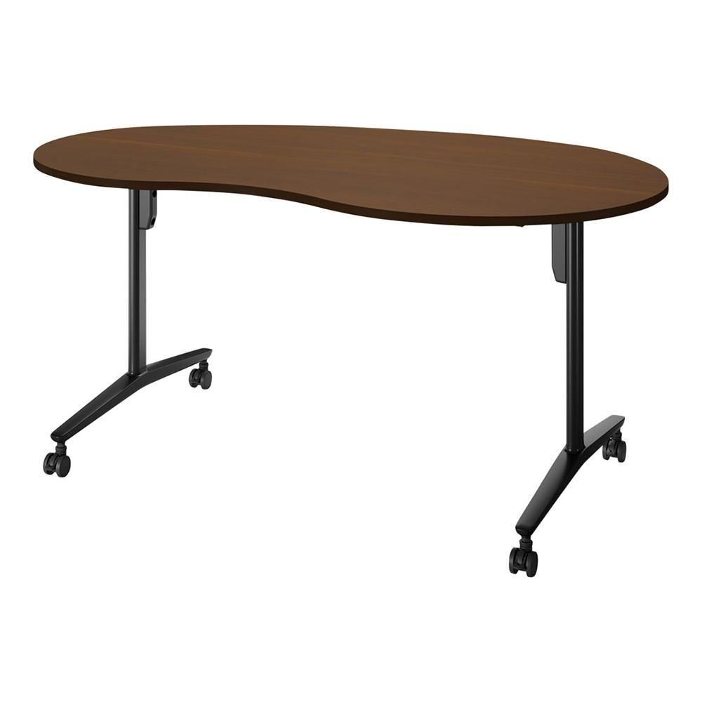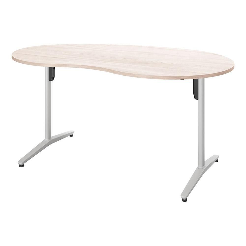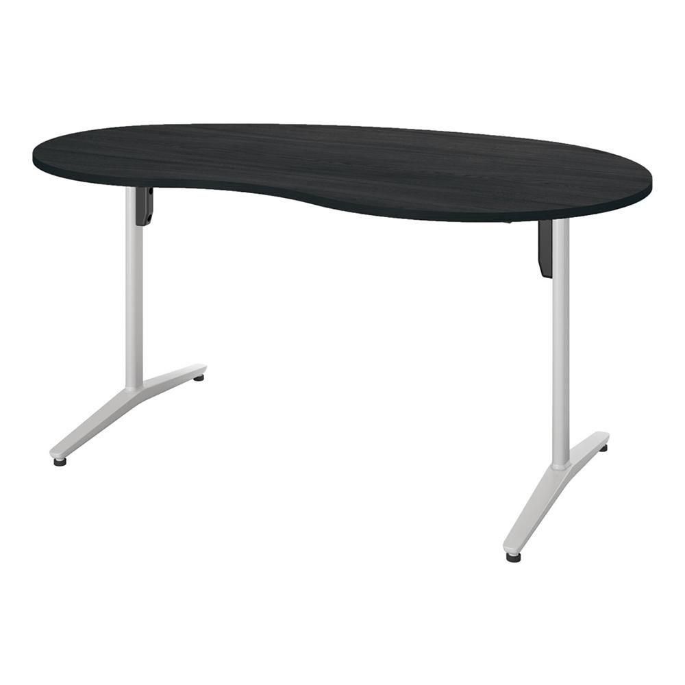 こちらの商品は、勾玉天板、T字脚、アジャスター、幅1500×奥行900×高さ720mmタイプです。脚カラーは3色、天板カラーは8色から選べます。